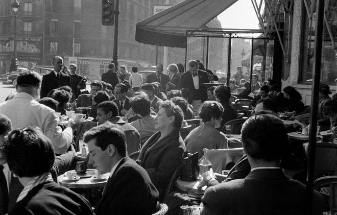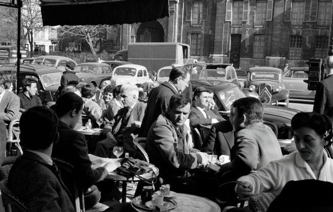 1957年3月5日,巴黎Saint Germain de Pre区的露台咖啡馆。巴黎老百姓一边喝着咖啡,一边晒着太阳。