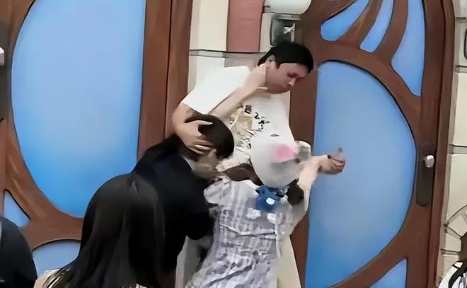 画面继续下去,情侣双方将孩子爸爸推搡到打卡拍照地的台阶上,全程都处于“一打二”的状态。