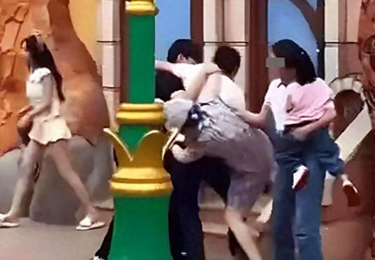 旁边有一抱着孩子的女子劝阻,情侣两个将火力集中在孩子父亲身上,而孩子妈妈则试图上前劝阻,另一只手则上前去拉穿着格子裙的女子。
