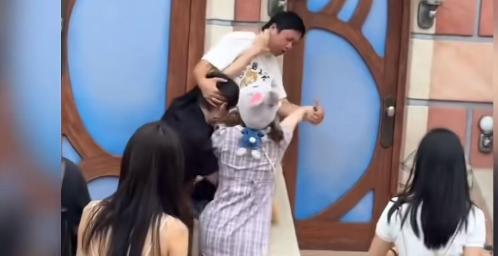 画面显示,一身穿粉紫色格子裙、头戴兔耳帽的女子和身穿黑色短袖的男友,与一名身着白色短袖的男子正在发生推搡。